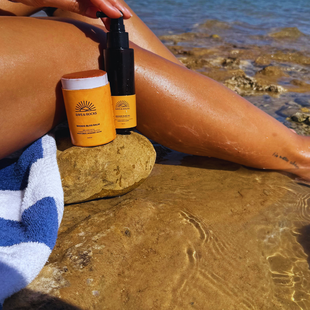 Get the ultimate beach glow with our power duo – the Bronze Bliss Balm and Bronze Bliss Tanning Oil. Designed to work in perfect harmony, this bundle deeply nourishes, enhances your natural tan, and leaves your skin feeling silky smooth.
